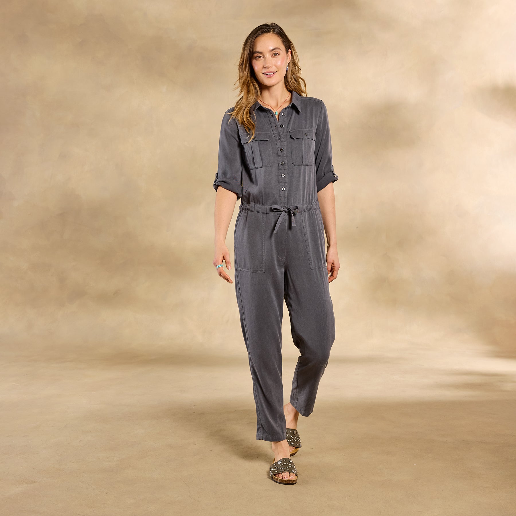Our jumpsuit has a relaxed. button-front silhouette with beautiful drape. six pockets. drawstring tie. roll-tab sleeves and distressed metal buttons. Lyocell/viscose. Machine wash. Imported. Exclusive. Sizes XS (0 to 2). S (4 to 6). M (8 to 10). L (12 to 14). XL (16 to 18). XXL (20 to 22). Approx. 61L. 28-1/2 inseam.