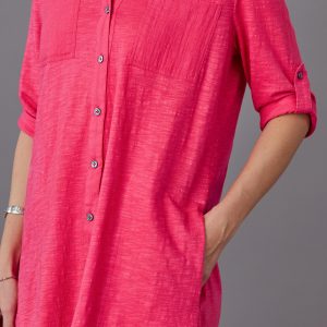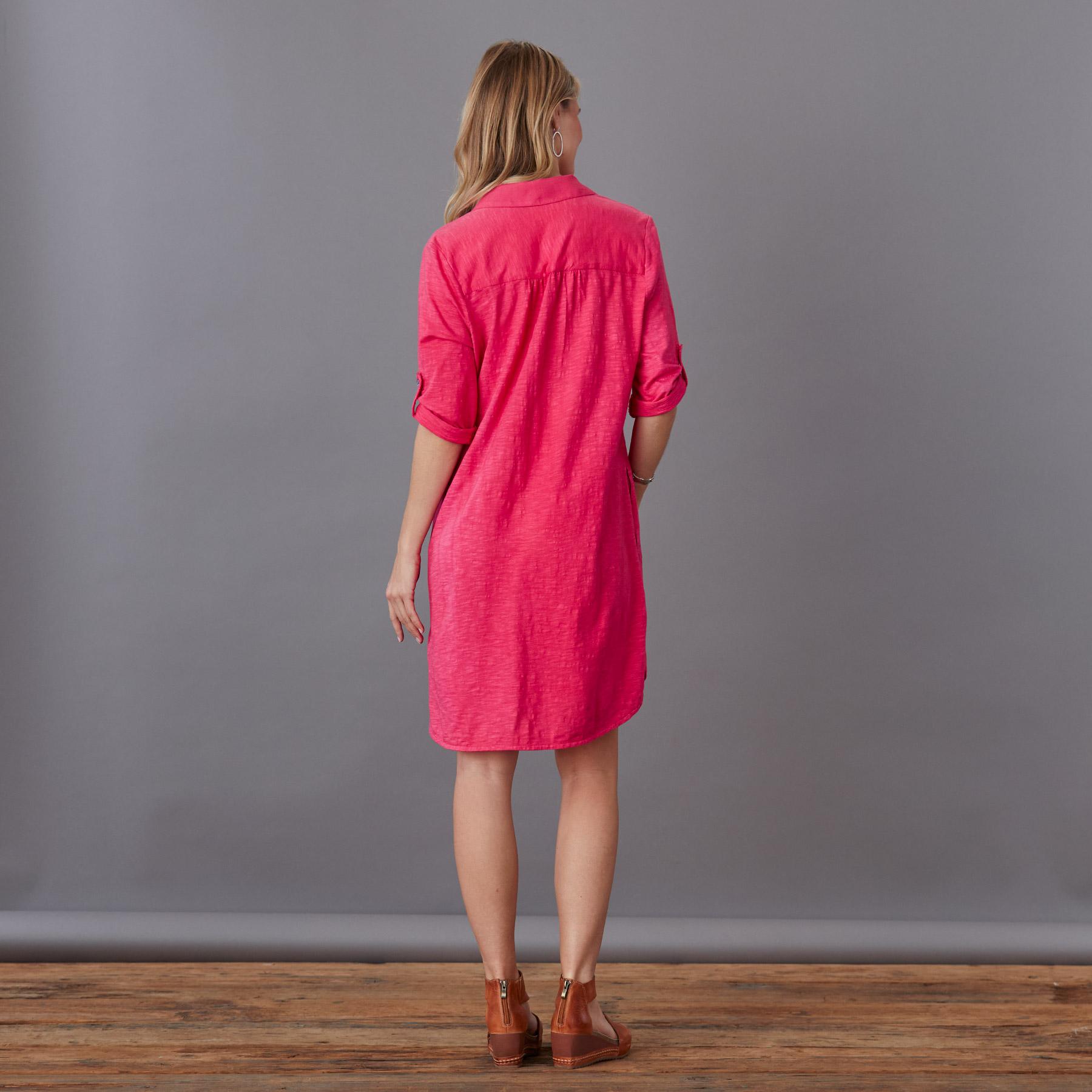 Easy and relaxed. our button front shirt dress is knit in a cozy fabric with woven front pockets. roll tab sleeves and smoke shell buttons. Shirttail hem. Cotton. Machine wash. Imported. Exclusive. Sizes XS (0-2). S (4-6). M (8-10). L (12-14). XL (16-18). XXL (20-22). Approx. 36l.
