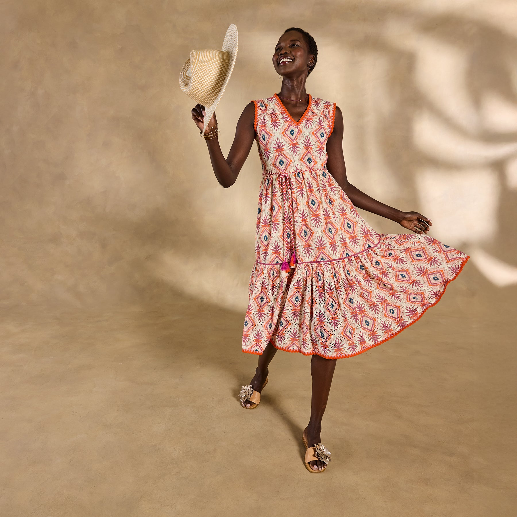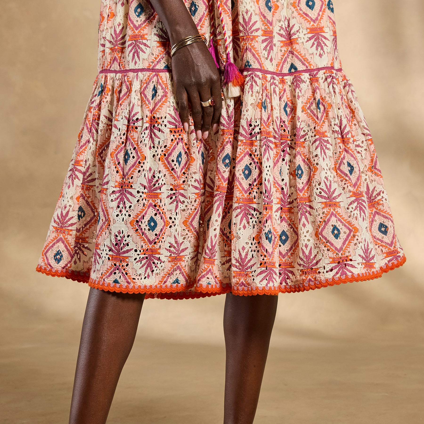 Airy eyelet PLUS a punchy print??more is always more with our charming sleeveless Annetta Dress. Flattering notch neckline with crochet detail; removable rope belt with tassel. Fully lined. Cotton. Machine wash. Imported. Exclusive. Sizes XS (0-2). S (4-6). M (8-10). L (12-14). XL (16-18). XXL (20-22). Approx. 45l.