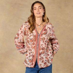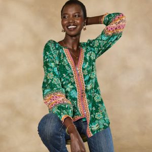 Opulent florals and elegant border prints combine to intoxicating effect. Sleek. body-skimming fit with flattering V-neck and three trios of delicate buttons. Cotton/silk. Machine wash. Imported. Exclusive. Sizes XS (0?C2). S (4?C6). M (8?C10). L (12?C14). XL (16?C18). XXL (20?C22). Approx. 26.5l.