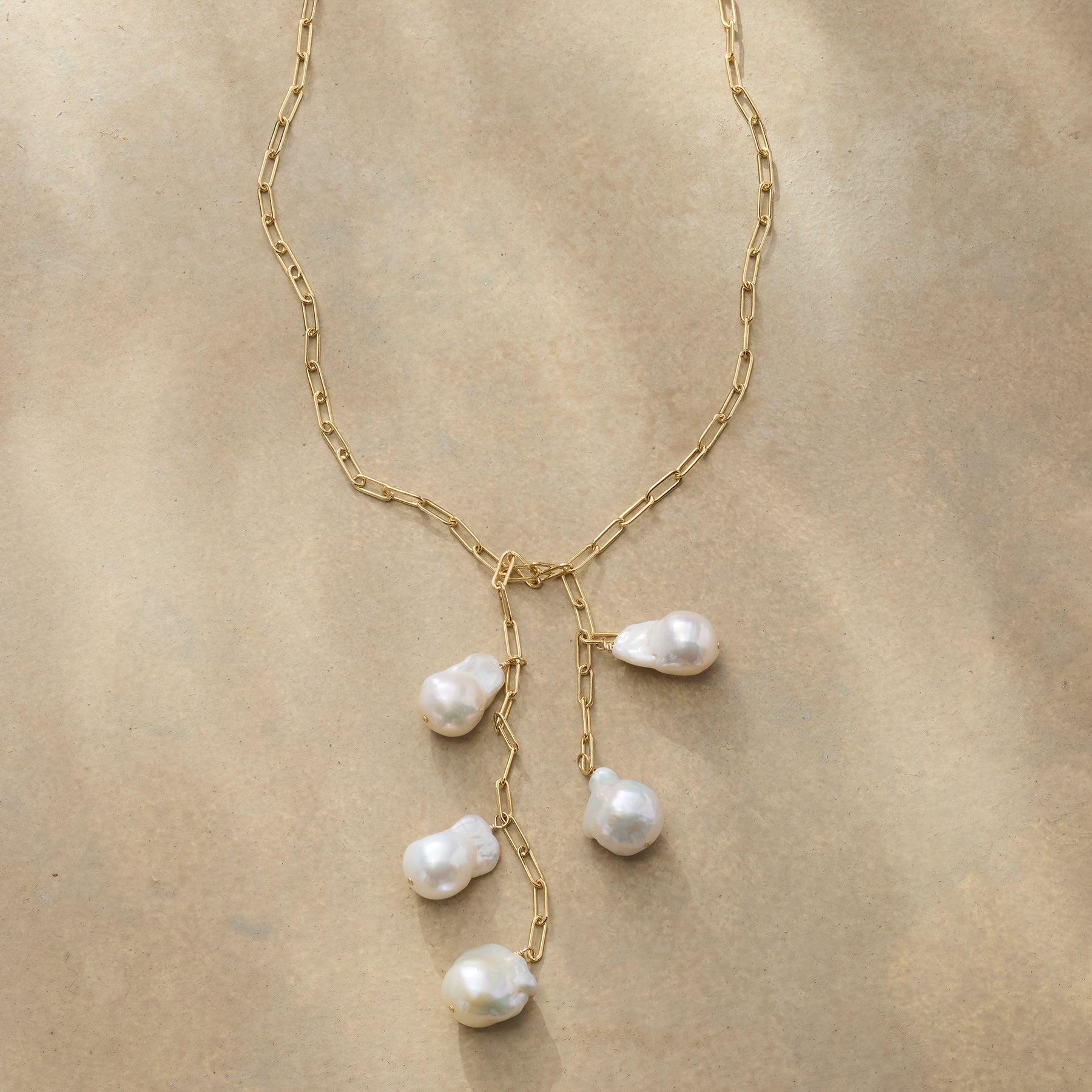 Worn long or doubled. this delicate lariat necklace will perk up any outfit. Handcrafted with 12kt gold-filled paper-clip chain and white baroque pearls. Made in USA. 36l.