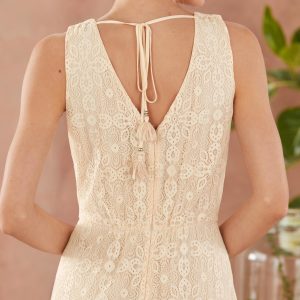 Turn heads in our sleeveless. faux-wrap maxi dress with allover lace. ruffles. V front and back with elegant ties. Nude lining. Back zip. Nylon/spandex. Hand wash. Imported. Exclusive. Sizes XS (0 to 2). S (4 to 6). M (8 to 10). L (12 to 14). XL (16 to 18). XXL (20 to 22). Approx. 58L.