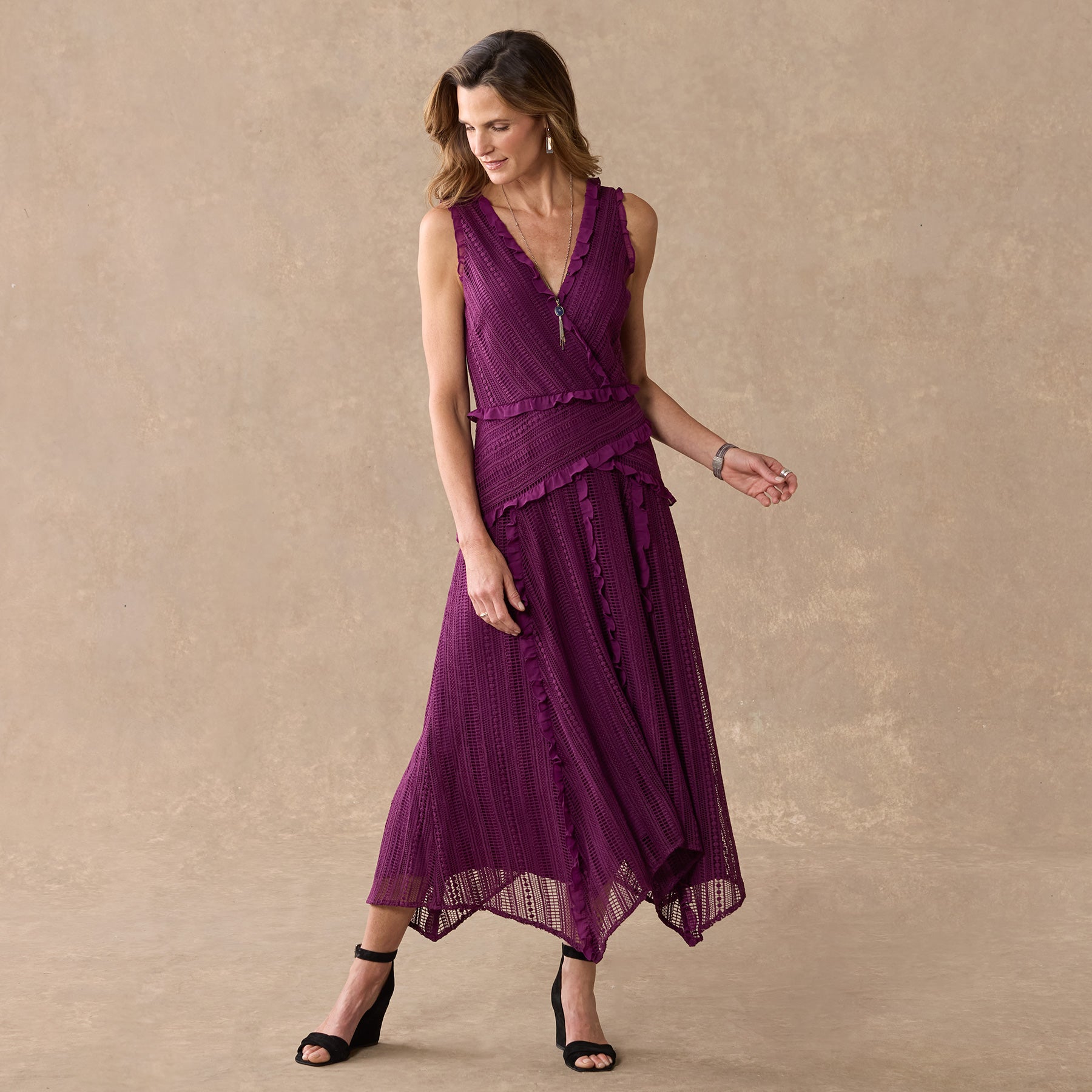 This stunning midi-length dress features a surplice front with ruffles. a handkerchief hem and linear lace with beautiful ruffle detail. Fully lined. back zipper. Polyester. Machine wash. Imported. Sizes XS (0-2). S (4-6). M (8-10). L (12-14). XL (16-18). XXL (20-22). Approx. 54l.