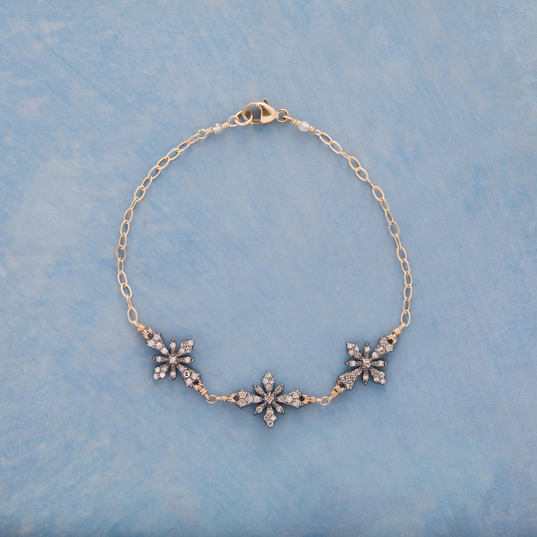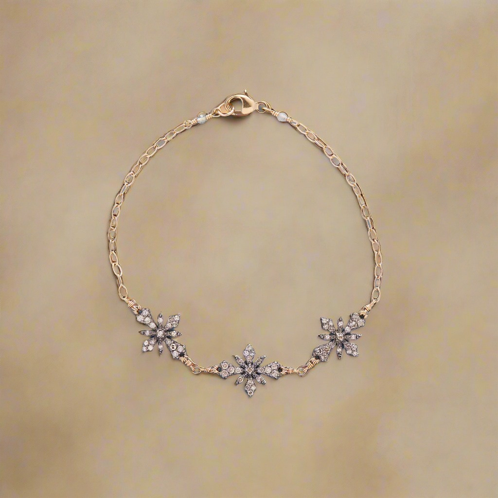 A trio of sterling silver fleurettes gleams with the sparkle of diamond pav??. Links of 14kt gold. Lobster clasp. Exclusive. Handmade in USA. 7L.