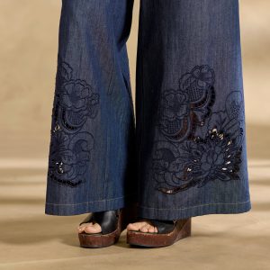 About to unseat your favorite jeans from their throne: the Frankie Easy Pants from Johnny Was. Crafted of lightweight selvedge chambray with tonal broderie Anglaise; front button and zipper. back elastic waist. Pair with Cecila Blouse for a matched set. Cotton. Hand wash. Imported. Sizes XS (0?C2). S (4?C6). M (8?C10). L (12?C14). XL (16?C18). XXL (20?C22). Approx. 29 inseam; 11 rise.