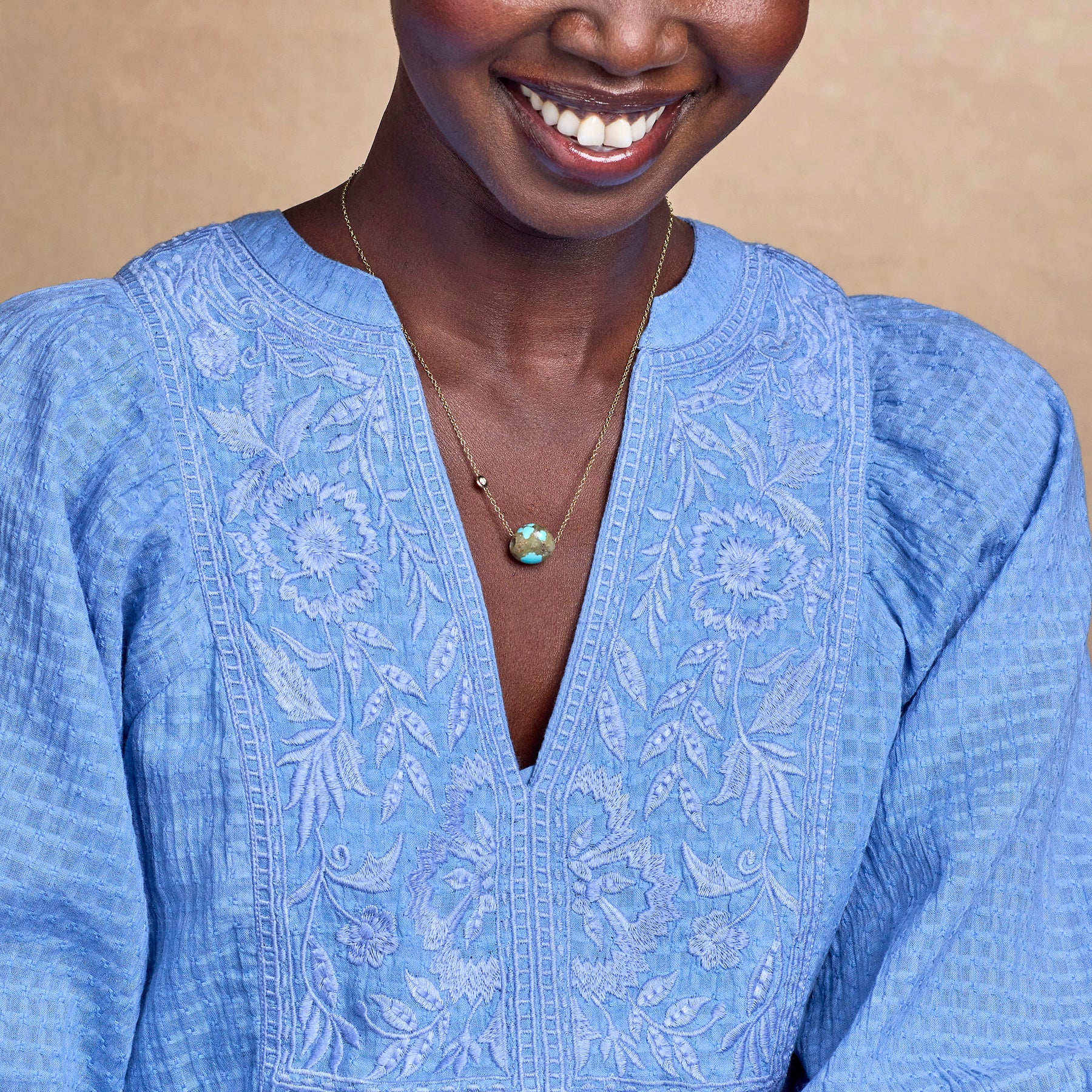 From Arizona. with love. Our Manteca Necklace showcases a souvenir from the famous Kingman mine: a rare blue-green turquoise nugget. Embellished with a glint of diamond. this special necklace is an expression of your unique self. 14kt gold chain and spring-ring clasp. Handcrafted in USA. 18l.