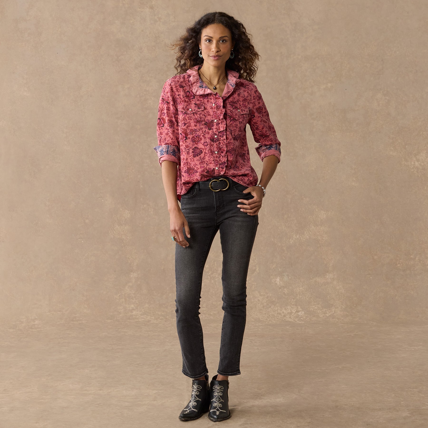 Floral printed and overdyed. this Western inspired. soft corduroy shirt is beautiful with ruffles at the neckline for a feminine twist. Two patch pockets. snap closure and bandana print detail inside. Cotton. Machine wash. Imported. Exclusive. Sizes XXS (00). XS (0?C2). S (4?C6). M (8?C10). L (12?C14). XL (16?C18). Approx. 24l.