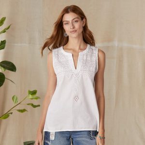 Vintage-inspired. cut-out embroidery accentuates the simple grace of this lightweight. airy tank with an easy. pull-over fit and notch neckline. Cotton. Machine. Imported. Sizes XS (0 to 2). S (4 to 6). M (8 to 10). L (12 to 14). XL (16 to 18). XXL (20 to 22). Front approx. 25-3/4L.