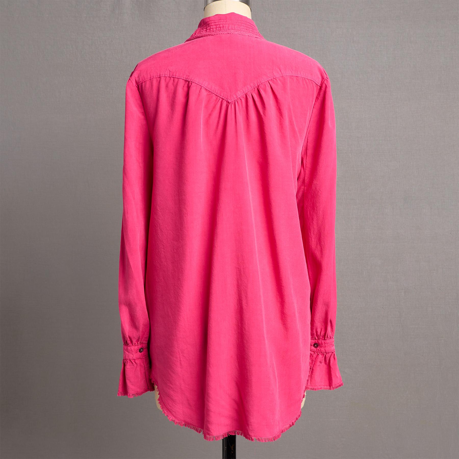 Western style at its most feminine. in beautifully washed. super soft and draping Tencel?. With embroidery and lace insert details at front panel and collar. ruffle cuffs. raw edges. delicate loop closures on smoked shell button front. shirttail hem and Western-style yoke front and back. Machine wash. Imported. Exclusive. Sizes XXS (00). XS (0-2). S (4-6). M (8-10). L (12-14). XL (16-18). Approx. 26l.
